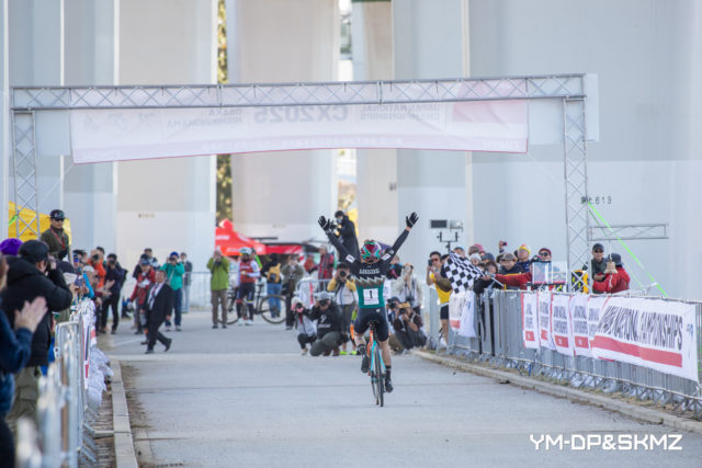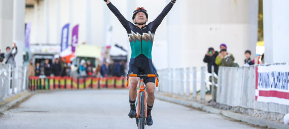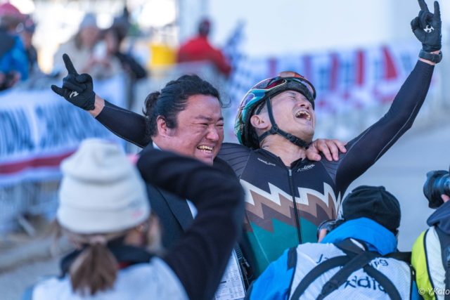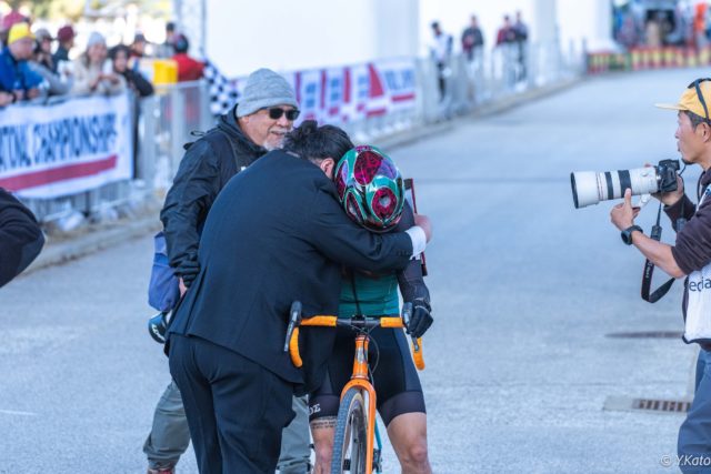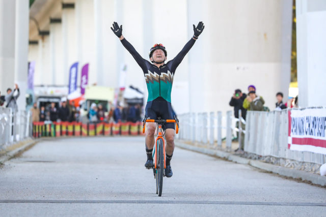 歓声の止まない砂浜を通り抜け、最後の階段を登ったあと少し周りが静かになります。「これでフィニッシュか」そう思うと、ボロボロと涙が出てきました。つらいトレーニングに耐えてきたというより、この場所で勝ちたい、勝つことで関西シクロクロスに関わるみなさんに恩返しをしたい、この想いとプレッシャーから解放された瞬間でした。