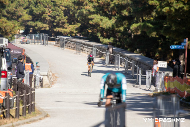 直線は誰かを風除けに使いたいところですが、自らプッシュしてライバルをオールアウトさせるくらいのつもりで踏みました。自分の方がギアが重い、だから向こうの方がケイデンスが高くて絶対ツライ。そう言い聞かせてレースを進めます。3周目に入った時点で今井選手が数秒遅れ、三宗選手と2人パックになりました。